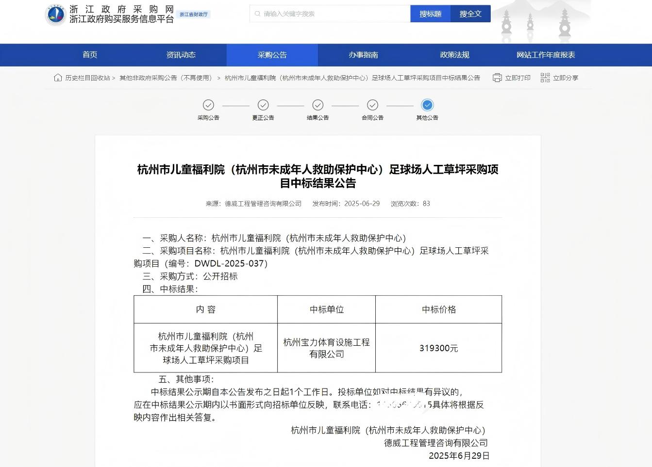 2025年6月29日中标杭州市儿童福利院(杭州市未成年人救助保护中心)足球场人工草坪采购项目