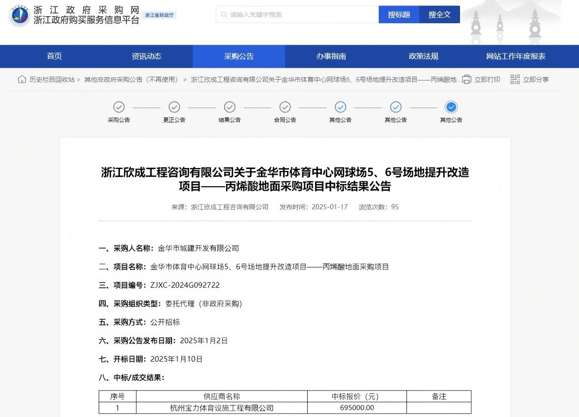 2025年1月17日中标金华市体育中心网球场5、6号场地提升改造项目一丙烯酸地面采购项目