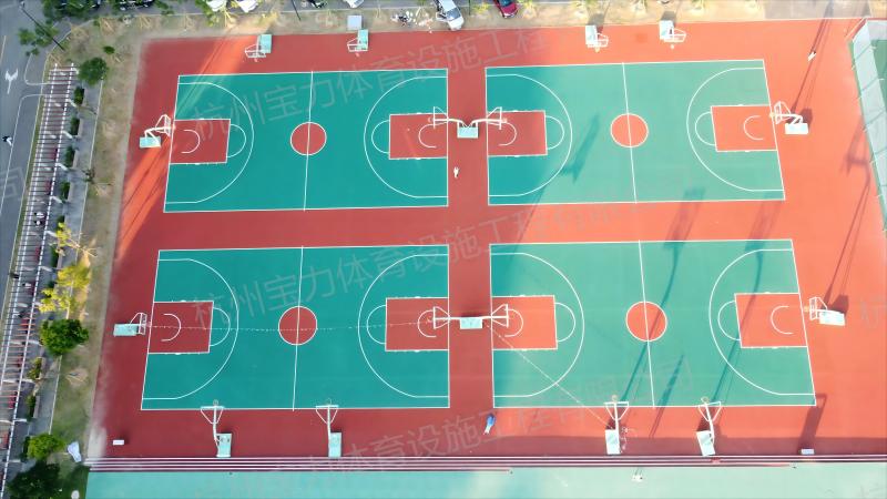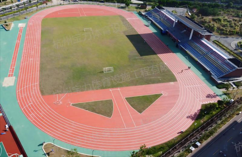 2024年由杭州宝力体育设施工程有限公司承建的温州医科大学洞头校区项目,含标准塑胶跑道、多彩看台及篮球场等,周边红砖建筑与绿化带相映,营造活力健康的校园氛围,满足多样化体育需求。